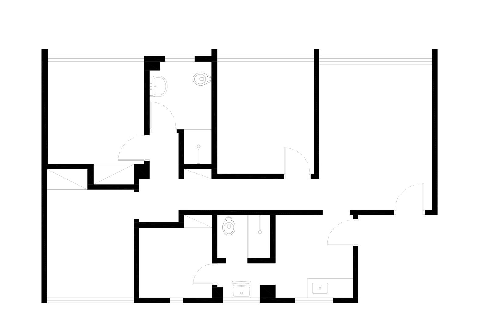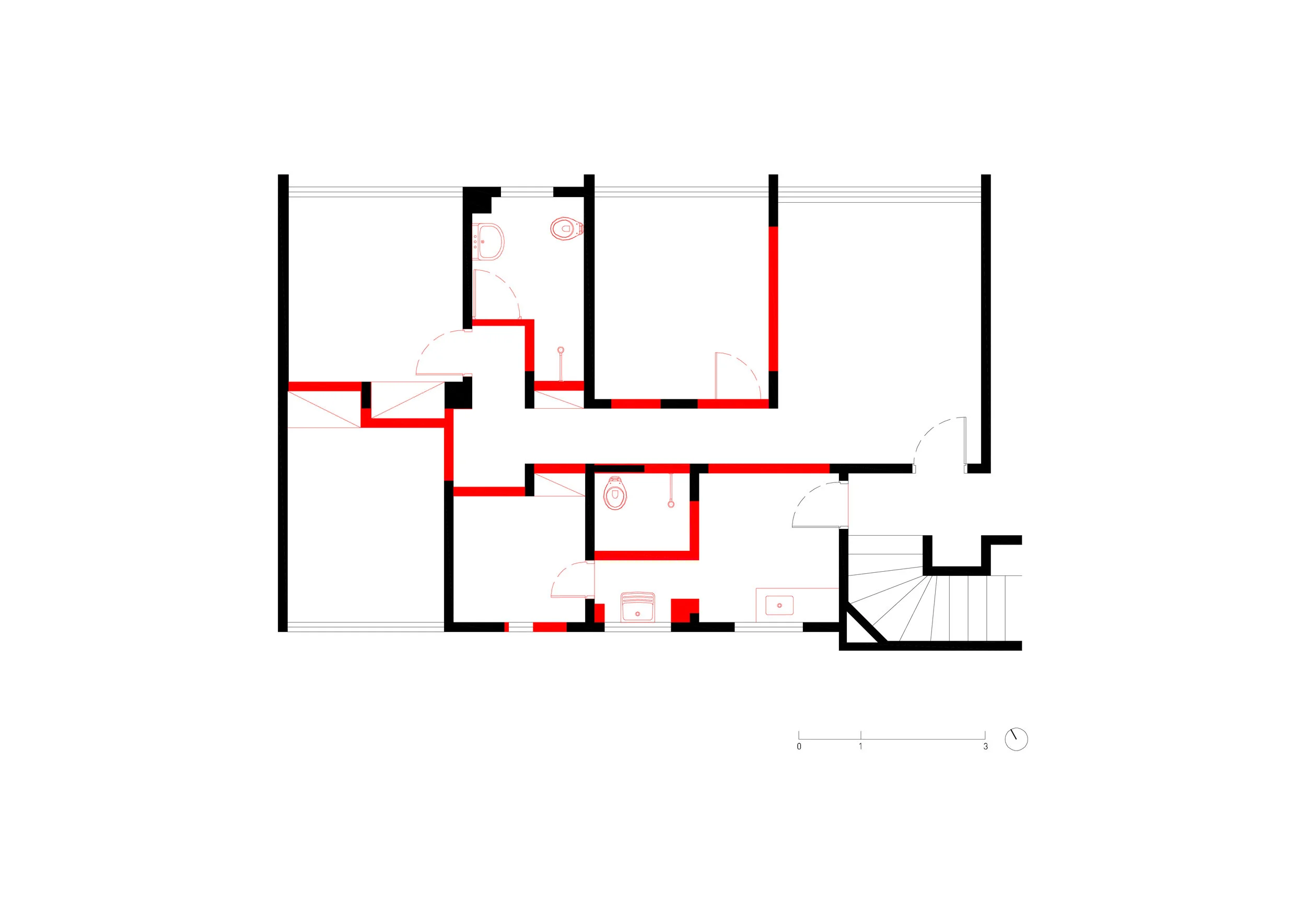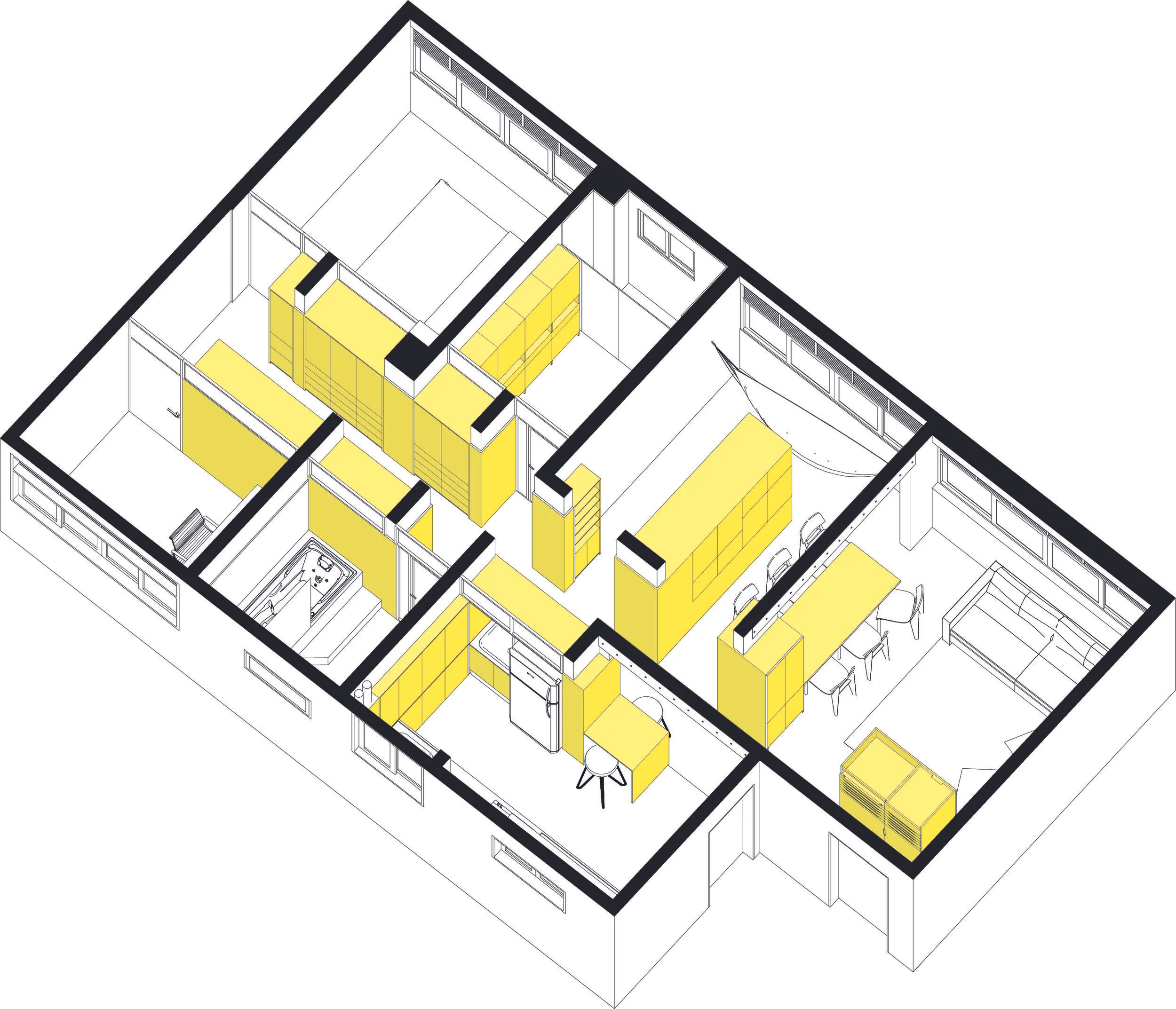 O projeto buscou viabilizar uma obra de baixo custo equacionando a difícil relação entre a restrição para demolição de grandes vãos da alvenaria portante e a grande integração dos espaços solicitada pelos clientes. Propôs-se um longo móvel contínuo, formado por duas linhas de armários “encaixadas” entre os vãos deixados pela demolição criteriosa das paredes. Este objeto trata de organizar todo o programa da residência, criando espaços de naturezas distintas. O corredor central, espinha dorsal da casa, além de servir como closet, dá acesso aos quartos e banheiros.