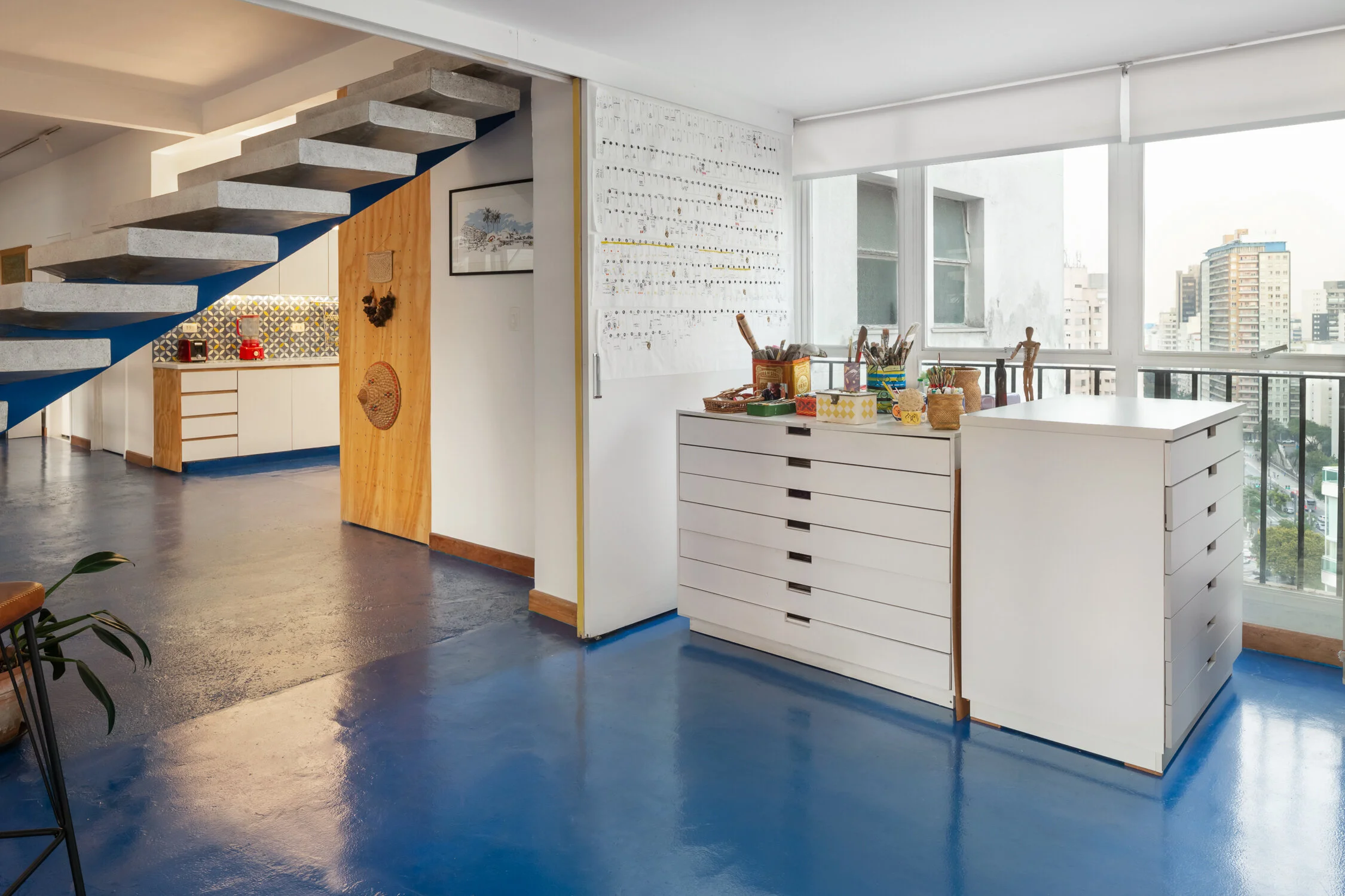 A escada monumental, assim como os pisos de taco de madeira originais foram preservados e restaurados. Nos pisos da cozinha, circulação e ateliê empregou-se pintura epóxi na cor azul, aplicada sobre contrapisos remendados. Tal operação objetivou evidenciar as intervenções promovidas na obra, o que resultou em maior rusticidade no acabamento – proposta muito bem aceita pelos clientes.